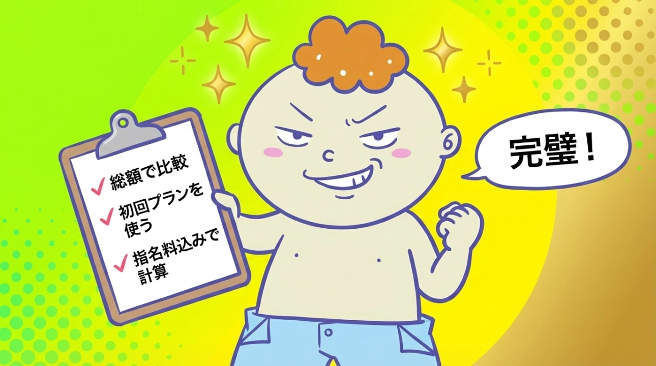 基本料金だけでなく、指名料・オプション込みの総額で比較することが大切です。「基本は安いが指名料が高い」店舗もあるため、初回はシンプルな構成で比較するのがおすすめです。