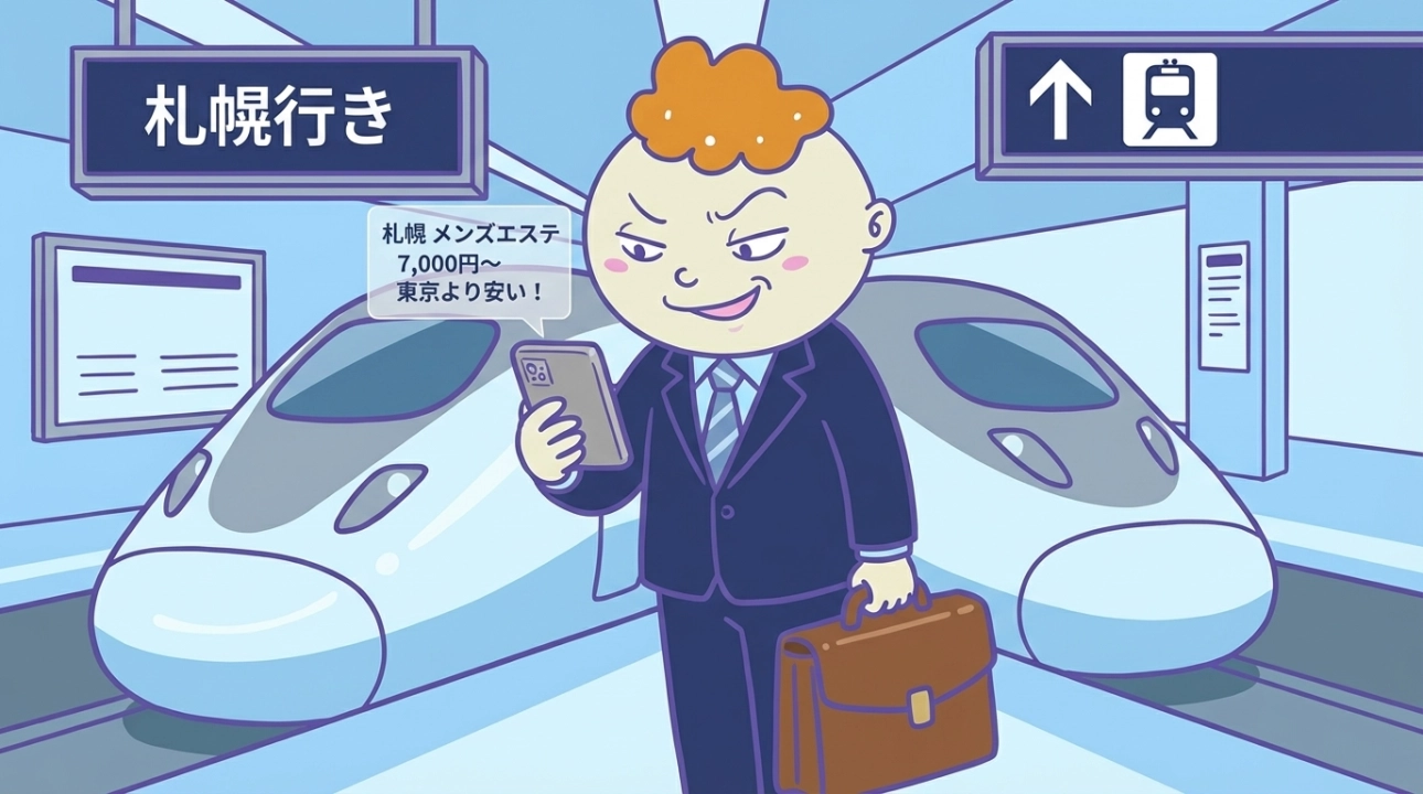仕事で札幌に来るたびに感じること,, 東京より2,000円は安い。北海道新幹線・飛行機で訪れるビジネスマンの間で、札幌のメンズエステは密かに人気です。日本有数の歓楽街「すすきの」を抱え、料金も安い。「せっかく来たから使ってみよう」に変わりやすい街です。ただ初めてすすきので選ぼうとすると途方に暮れることがある。この記事で全部まとめます。