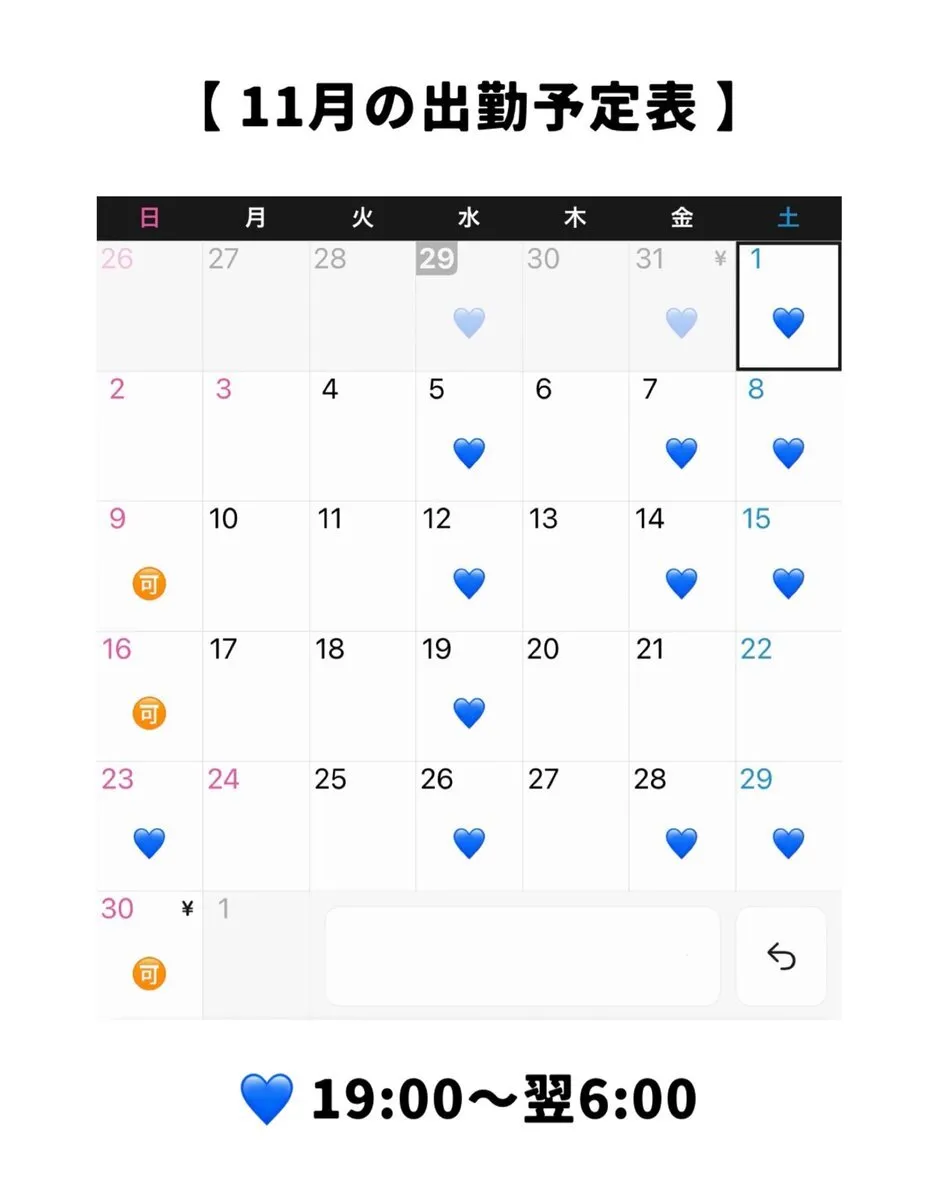 11月の出勤予定表です! 週末は星野らむにお任せください🙋♀️✨ 癒されたいお兄様、アニメやゲーム好きなお兄様はぜひ! メンエス初めてのお兄様も大歓迎です! 事前予約だと嬉しいです!☺️🧡 https://t.co/JXqi6DDjWI