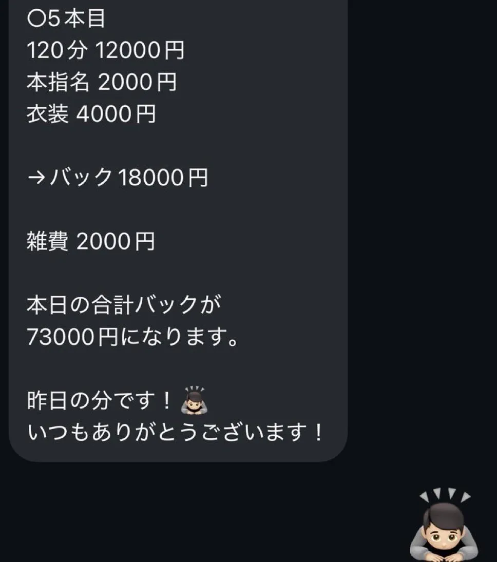 本日の出勤、全員俺の紹介だった。店舗の繁栄の役に立てて、女の子が続けたいと思えるような店舗に紹介できて本当に幸せに思います。関東のメンエスは任せてください。横浜も都内も千葉も俺が1番って言われるようになりたいです。みんなの力貸してください。みんなの力になれるように頑張るので。