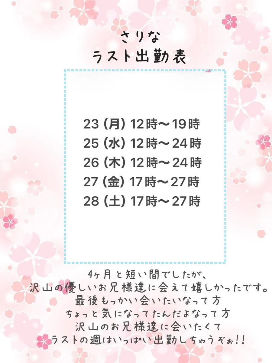 さりな来週の出勤表です! ラストにして、初の出勤表出してみた 珍しく平日のお昼から夜までいるよ✨ お会いしたことあるお兄様 名古屋、一宮、岐阜でメンエスを お探しのお兄さん待ってるね pic.x.com/AV2CrzkT7f