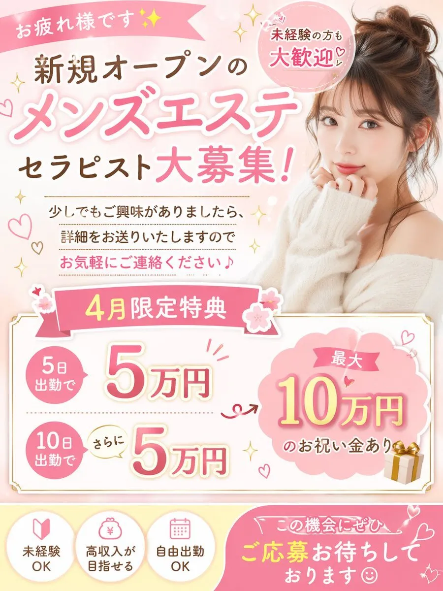 お疲れ様です✨ 現在、新規オープンのメンズエステでセラピストを募集しております。 未経験の方も大歓迎です☺️ 少しでもご興味がありましたら、詳細をお送りいたしますのでお気軽にご連絡ください。 さらに【4月限定特典】として、 ・5日出勤で5万円 ・10日出勤でさらに5万円 pic.x.com/hvt6RmPUBn