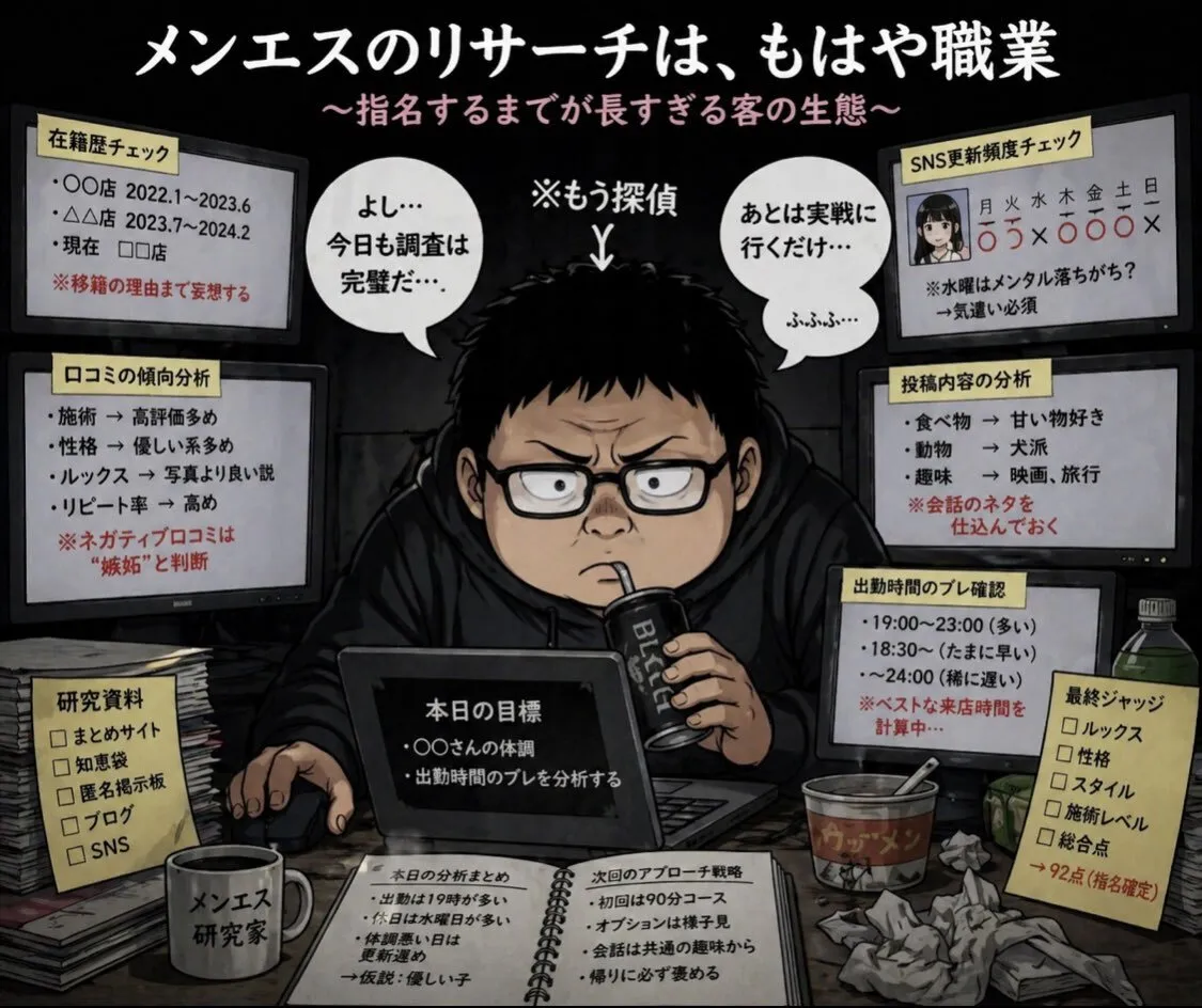 メンエス〇〇店のセラピは良かった、悪かった って客垢の熱弁ポストをよく目にするけど メンエスのユーザーって やたらとプロ意識高くて 指名で行く前にその子のリサーチめちゃくちゃしてる ・過去の在籍歴 ・X、ブルスカの更新頻度 ・口コミの傾向 ・SNSの投稿内容 ・出勤時間のブレ 熱量ヤバいデス pic.x.com/iPpJ3R69fj